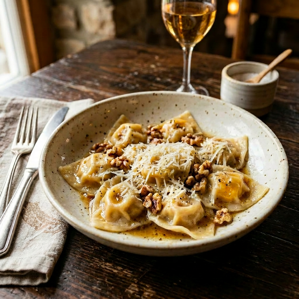 - Plate with Wonton Ravioli. Arrange 6 ravioli on each of 6 plates: sprinkle each serving with 1 teaspoon walnuts, sprinkle with parmesan cheese.