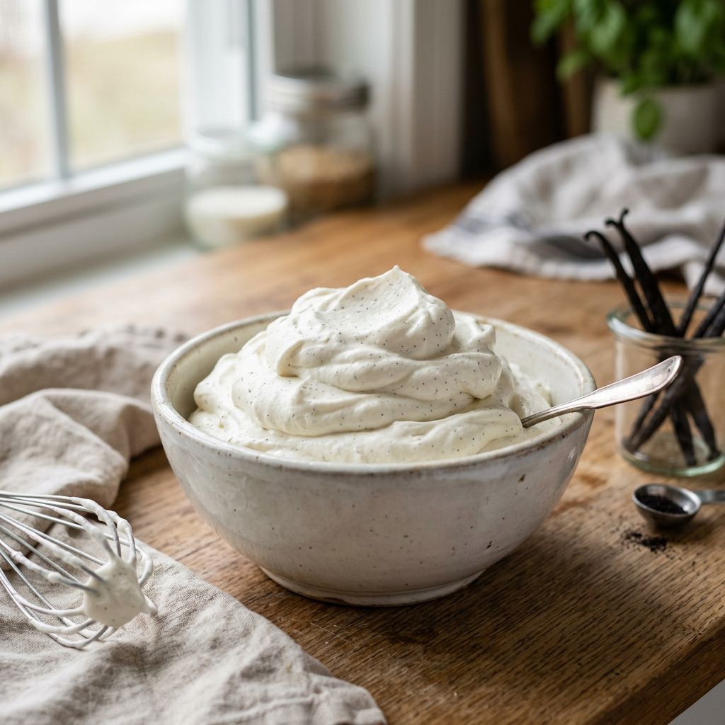 Crafted with fresh ingredients, this whipped cream has a smooth, creamy texture and a pleasant vanilla aroma. It is a versatile topping suitable for various desserts. You can use homemade vanilla whipped cream on:
