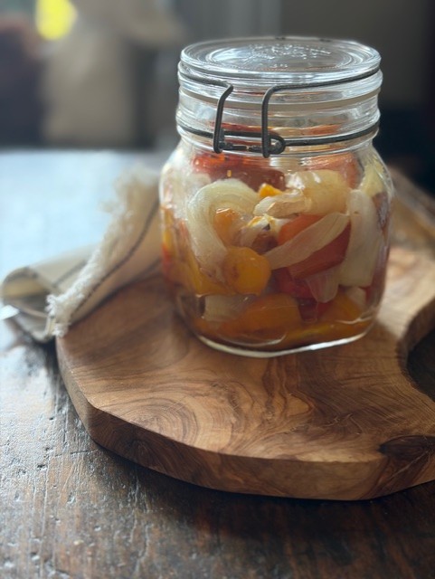 - Cut peppers into chunks and layer with the roasted onion slices in a clean glass jar with a tight-fitting lid.